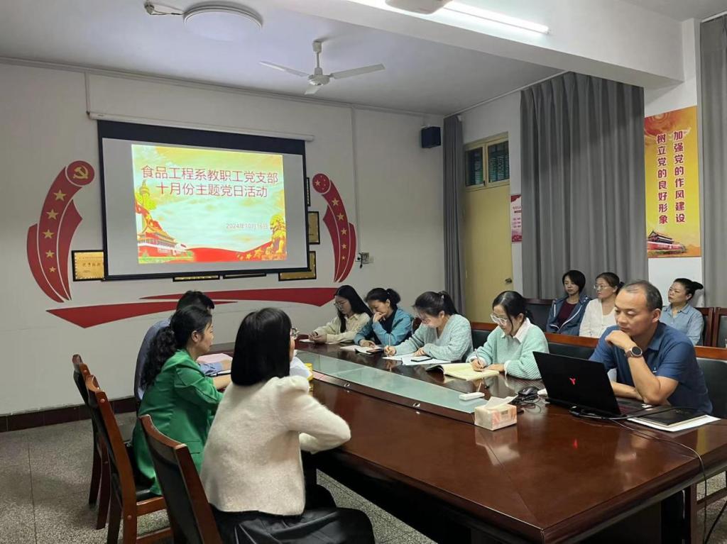 10月16日,食品工程系教工党支部在系党员活动室召开10月份主题党日活动。本次活动由食品工程系教职工党总支负责人王新娜主持,全体党员参加活动。
