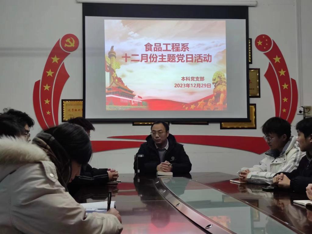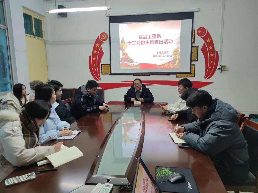 为深入学习贯彻习近平新时代中国特色社会主义思想,引导广大党员弘扬传统文化,坚定文化自信,切实提高党员自身的文化素养和意识形态。12月29日,食品工程系本科党支部在系会议室开展12月份主题党日活动,本次活动由党支部书记耿浩鹏主持,全体党员员工参加。