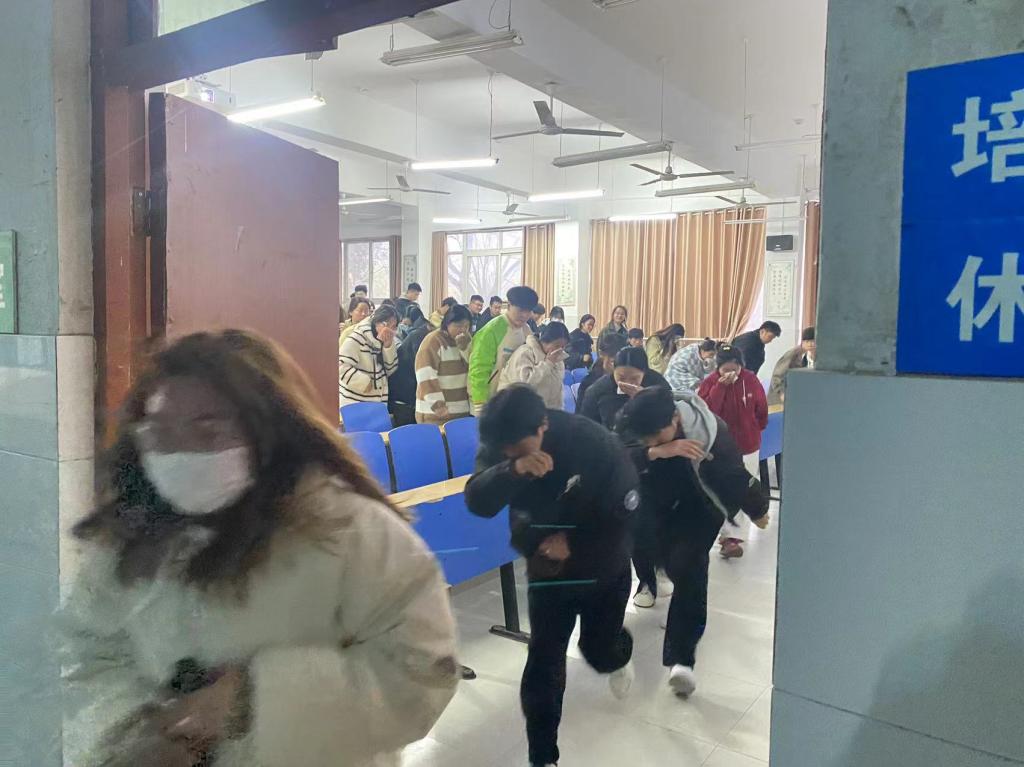 接下来,活动现场进行了模拟演练。随着消防警报拉响,全系师生根据《公司消防应急预案》迅速到达指定位置。按照楼层安全出口的方向,各年级同学分南、北、西三个出口迅速撤离3号教学楼。同学们弯腰捂鼻贴墙快速前移,撤离队伍井然有序。从警报声响起,到最后一名员工到教学楼门口,用时不超过60秒。通过这次演习,提高了师生的消防安全意识,增强了自我保护能力。