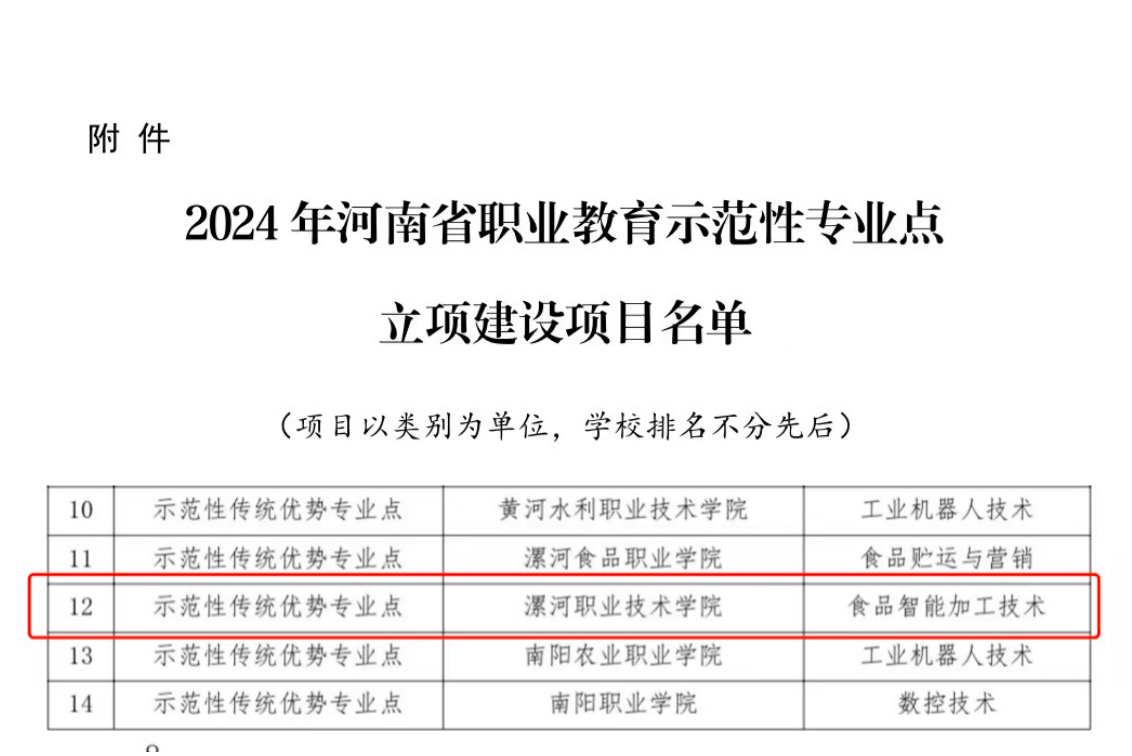 8月9日,河南省教育厅公示《2024年河南省职业教育示范性专业点建设项目拟立项项目名单》,食品工程系食品智能加工技术专业立项省级示范性传统优势专业点。
