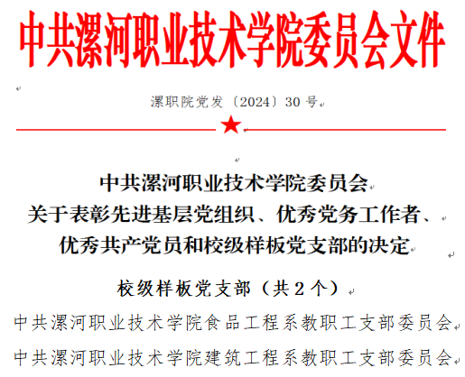近日,在中共taptap点点体育委员会关于表彰先进基层党组织、优秀党务工作者、优秀共产党员和校级样板党支部的决定中,食品工程系教职工党支部被选树为“校级样板党支部”。