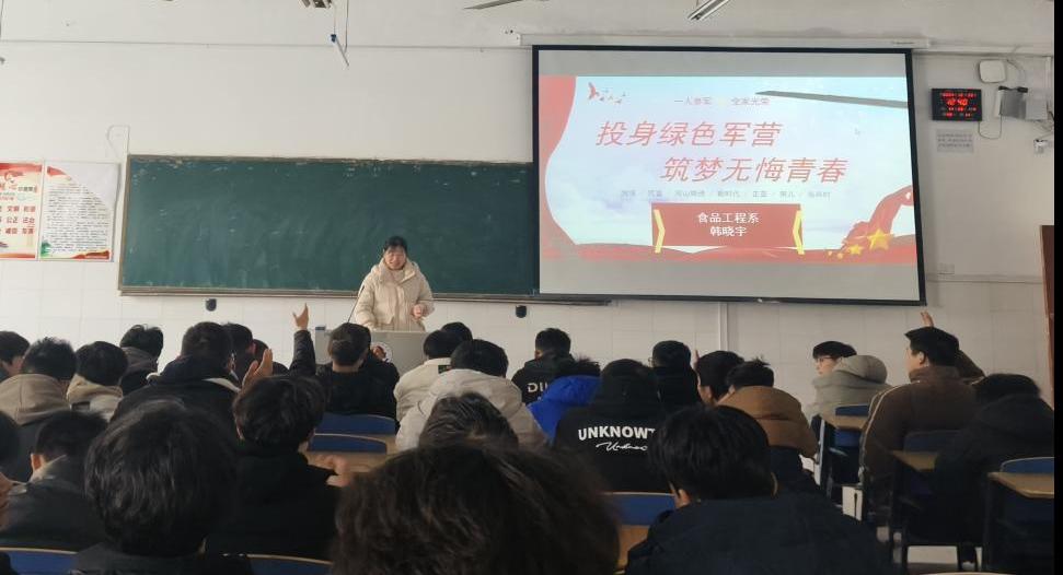 为进一步做好老员工参军入伍政策宣传工作,激发员工随笔从戎、参军报国的热情,2024年12月26日,食品工程系在3104教室举行征兵入伍宣讲会。