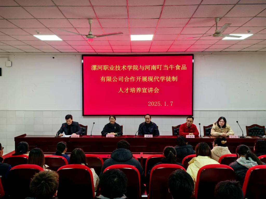 为深化产教融合,创新人才培养模式,推动叮当牛现代学徒制班组班,建班。1月7日由食品工程系牵头举办了taptap点点体育与河南叮当牛食品有限公司合作开展学徒制人才培养宣讲会。会议由食品工程系副主任闫建伟主持,食品工程系行政负责人崔惠玲,叮当牛食品有限公司技术总监王跃仝,检测、研发部工程师宗保丰,研发工程师胡立琴及各专业教师和员工代表参加。