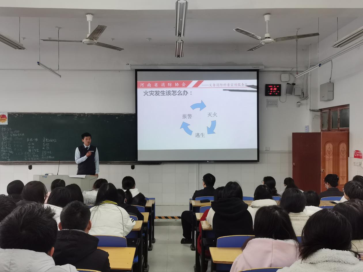 本次活动特别邀请了河南省消防协会义务消防科普宣传服务队薛金灿教员为大家进行讲解。薛金灿使用视频、图片、案例等多种方式向师生们生动地讲述了校园火灾的破坏力和火灾带来的严重后果,结合公司实际和常见的消防安全隐患,用通俗易懂的语言讲解了消防基础知识、火灾防范、扑救火灾方法及火场逃生要诀等内容。